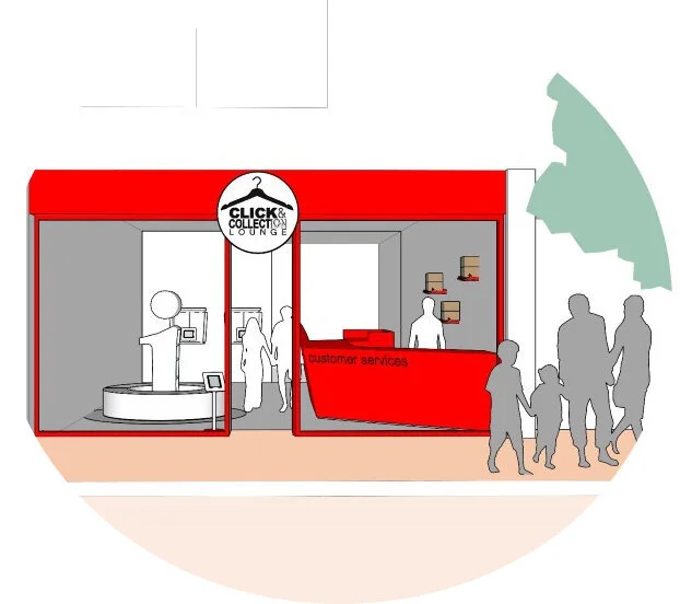 The ‘Click and Collect Lounge’ is a hybrid offer with the convenience and economy of online shopping combined with the sensory nature of a physical retail experience. Here you can collect and trial your online purchases at a time to suit your schedule, maybe while part of town centre shopping trip, in a fashion oriented environment.