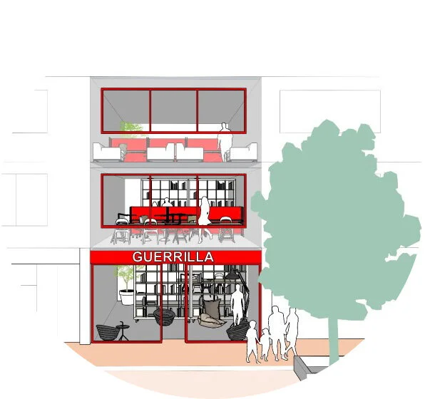The high street can be expanded vertically through vacant and disused spaces above shops for temporary uses such as pop-up co-working spaces like Holmes Miller’s Guerrilla Co-working concept. This not only solves the issue of vacant buildings’ negative effect on high street life but also provides a public facing facility (not a domestic box room) and resources for face to face meetings, reprographics and other office services and could even have a coffee shop at ground floor for use by co-workers and the public.