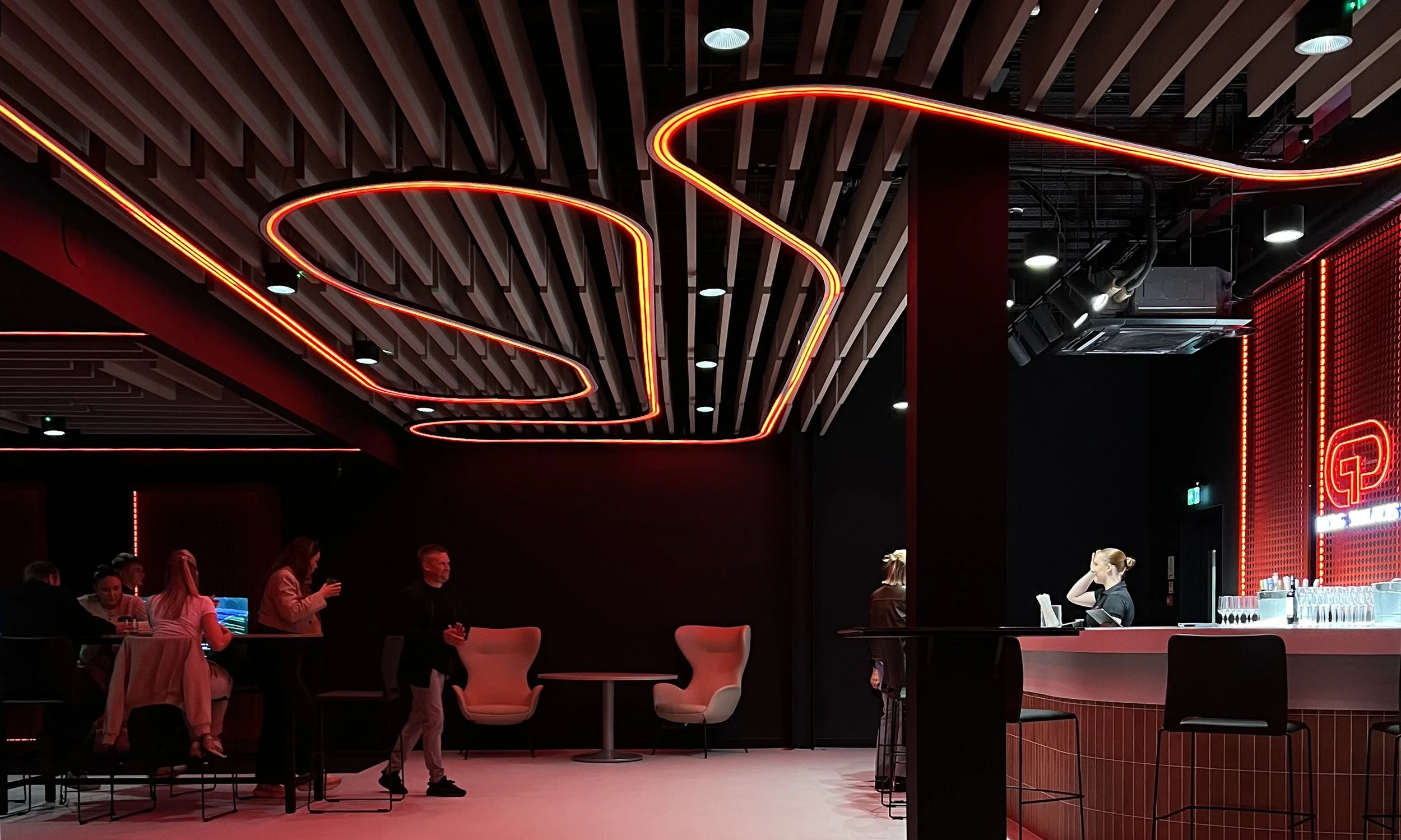 One feature that clearly captures the spirit of the venue is the bespoke suspended racetrack light. Shaped like a Formula 1 racing track with distinct lanes of lights chasing each other, the light enhances the overall aesthetic and reinforces the venue’s motorsport theme. Through this, and other interventions, the venue offers a unique racing experience while reflecting the competitive spirit of motorsport.